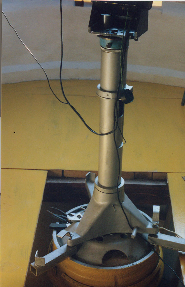 Оказалась она очень солидной и по настоящему пригодной для установки астрономических инструментов! Наличие микрометрических винтов у ее основания позволяет с величайшей точностью установить полярную ось. Кроме того, колонна снабжена 3 винтами, которые позволяют сделать точную горизонтальную установку оной. Для этого на ней установлен уровень! Основание, на котором установлен телескоп, я залил из бетона, на которое в свою очередь я надел обод от внутренней части колеса грузового автомобиля (на снимке он заметен хорошо)! Его диаметр порядка 70 см. Потом приварил уши под 120 градусов, которые стали опорой для колонны. Чтобы колонна не упала, я сделал углубления сверлом в тех местах, где стоят юстировочные винты и, кроме того, придумал еще один захват изнутри колонны. Теперь случайным движением колонну не сдвинуть! Уже получены первые снимки (2005 год) на новом, переделанном 5 метровом куполе обсерватории. Вот, пожалуй, и все краткое описание. Если вам захочется узнать что-то более подробно, то найдите мой контактный адрес на этих страницах и задайте интересующие вас вопросы. Спасибо!