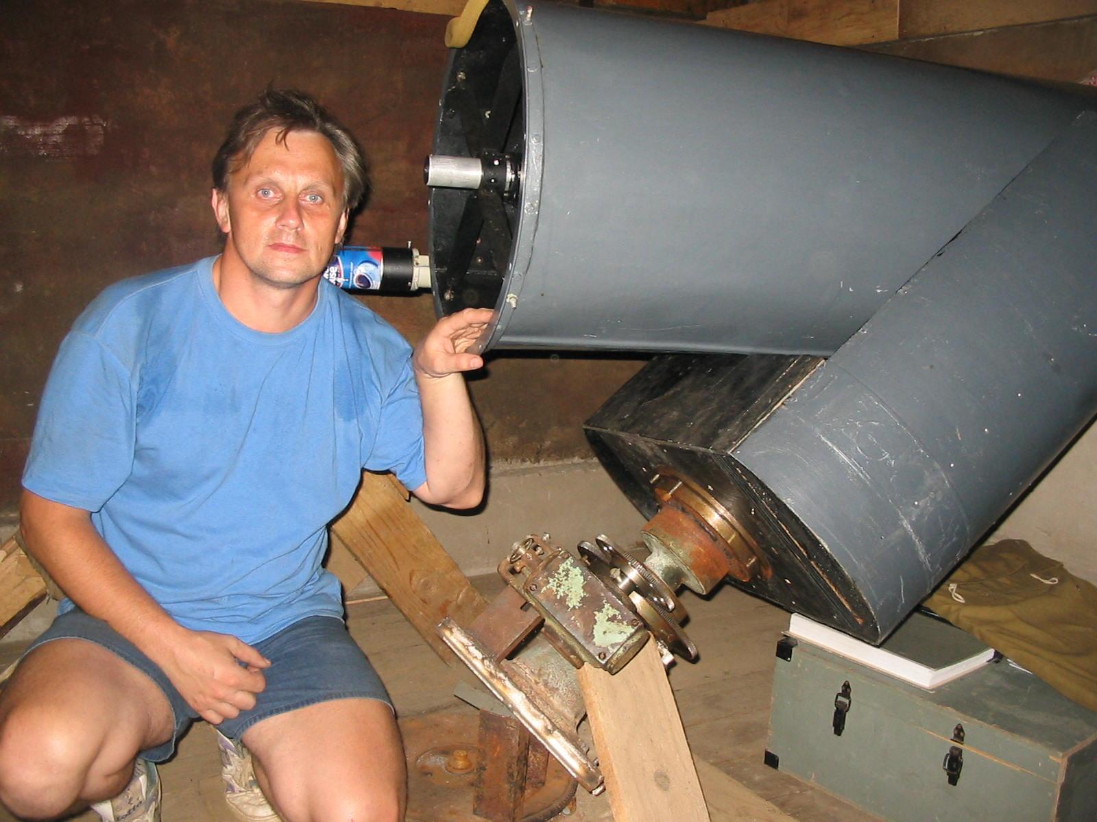 Также в моем распоряжении имеется часовой механизм для съемки неба, способный нести инструменты весом до 20 кг и ряд других, мелких инструментов. Также в арсенале имеется ПЗС камера Pictor 216 XT фирмы MEADE и камера KPC 600 BH, работающая в телевизионном режиме. Основными инструментами для съемки являются 150 (на снимке справа) и 110 мм Ньютоны, на которых проводится фотометрия комет, съемка звездного неба! Трубу 150 mm телескопа, как это не странно, я нашел на строительном объекте и сам не ожидая того. Ее в лучшем случае ждала участь быть уничтоженной в горниле строительной эпопеи! Но немножко расчетов, плюс мое желание и некогда бросовый кусок трубы, смотрит во Вселенную!