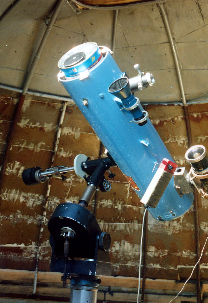 Главным инструментом обсерватории является 410 мм телескоп системы Ньютона с относительным отверстием 1:3.9. На нем я провожу визуальный поиск комет и наблюдения уже известных! Телескоп, а вернее его несущая часть, изготовлена из вентиляционной трубы диаметром около 500 мм. Вилка выполнена из стеклопластика, фанеры, досок и установлена на поворотном устройстве, которое обеспечивает плавное ведение по азимуту. Равнозрачковое увеличение данного инструмента составляет порядка 90 крат! Достаточно хороший параметр для поиска комет и их наблюдений!