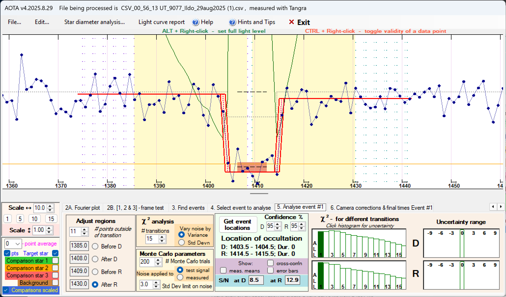 Положительное наблюдение покрытия астероидом звезды 2025-08-29. Астероид №9077 Ildo. График получен в программе AOTA: